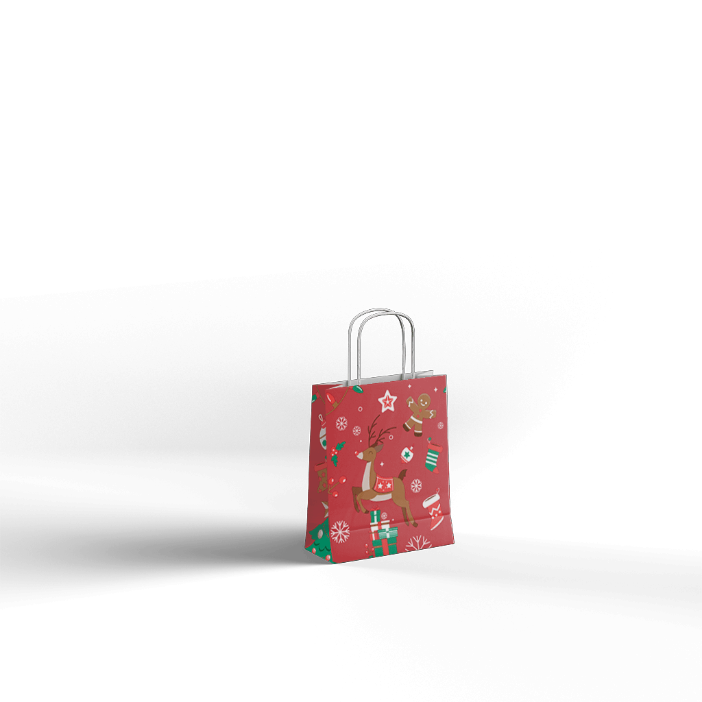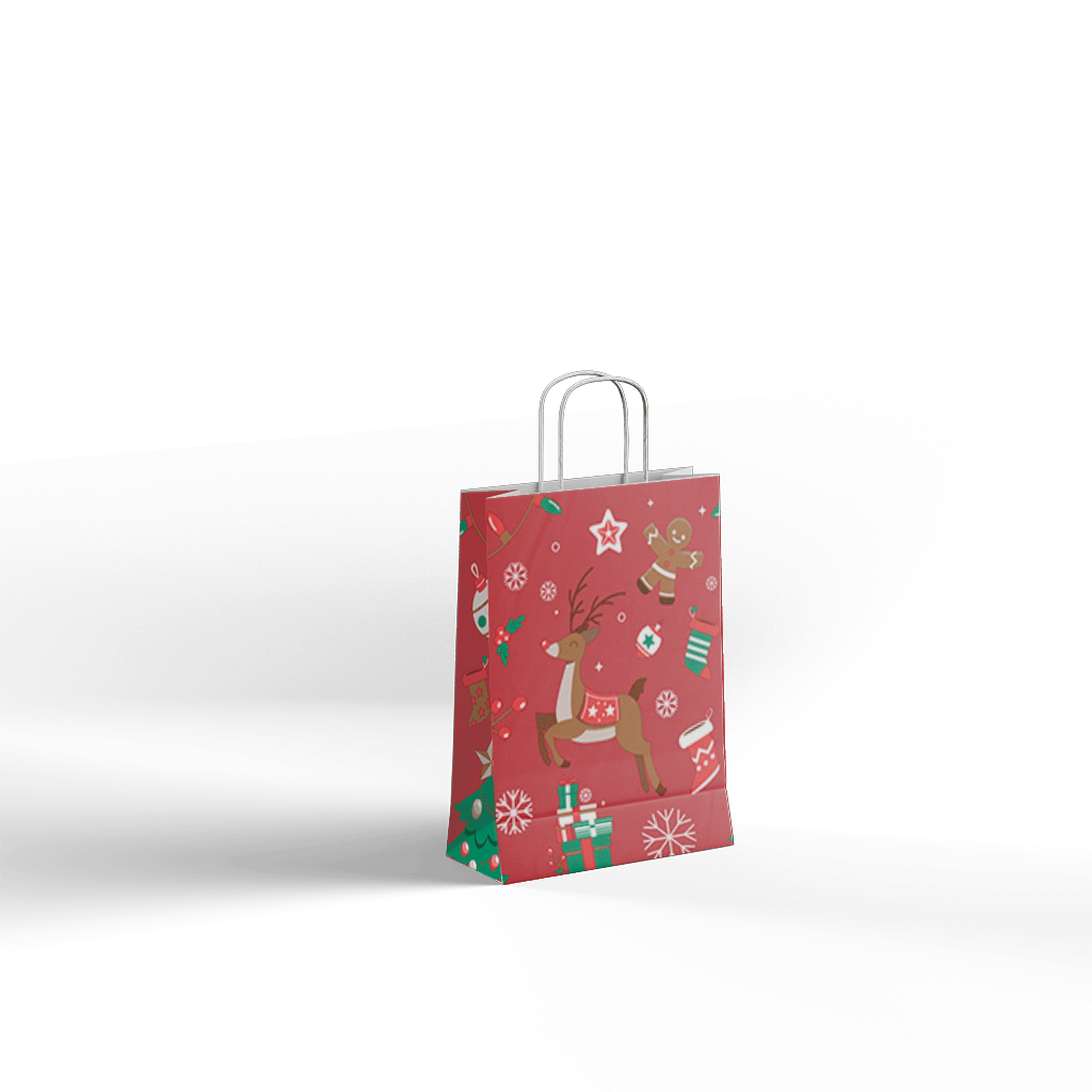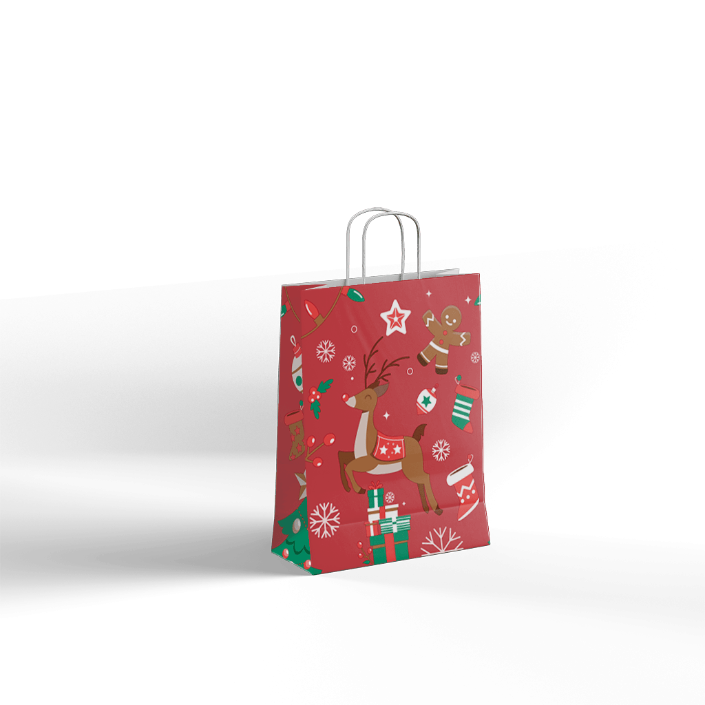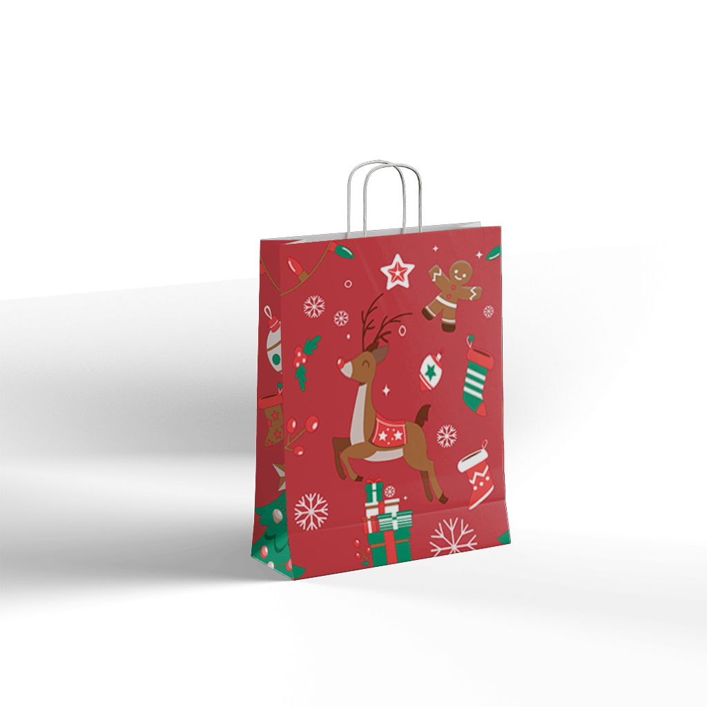 Papirnata darilna vrečka CHRISTMAS DEER z igrivo božično poslikavo jelenčka, daril in prazničnih motivov je odlična izbira za zavijanje božičnih daril, sezonskih paketov in promocijskih vsebin. Rdeča barvna podlaga v kombinaciji z ilustracijami ustvari topel, prazničen videz, ki pritegne pozornost in lepo dopolni obdarovanje.