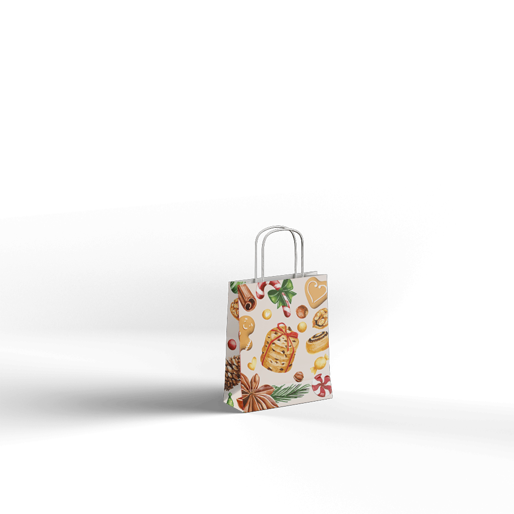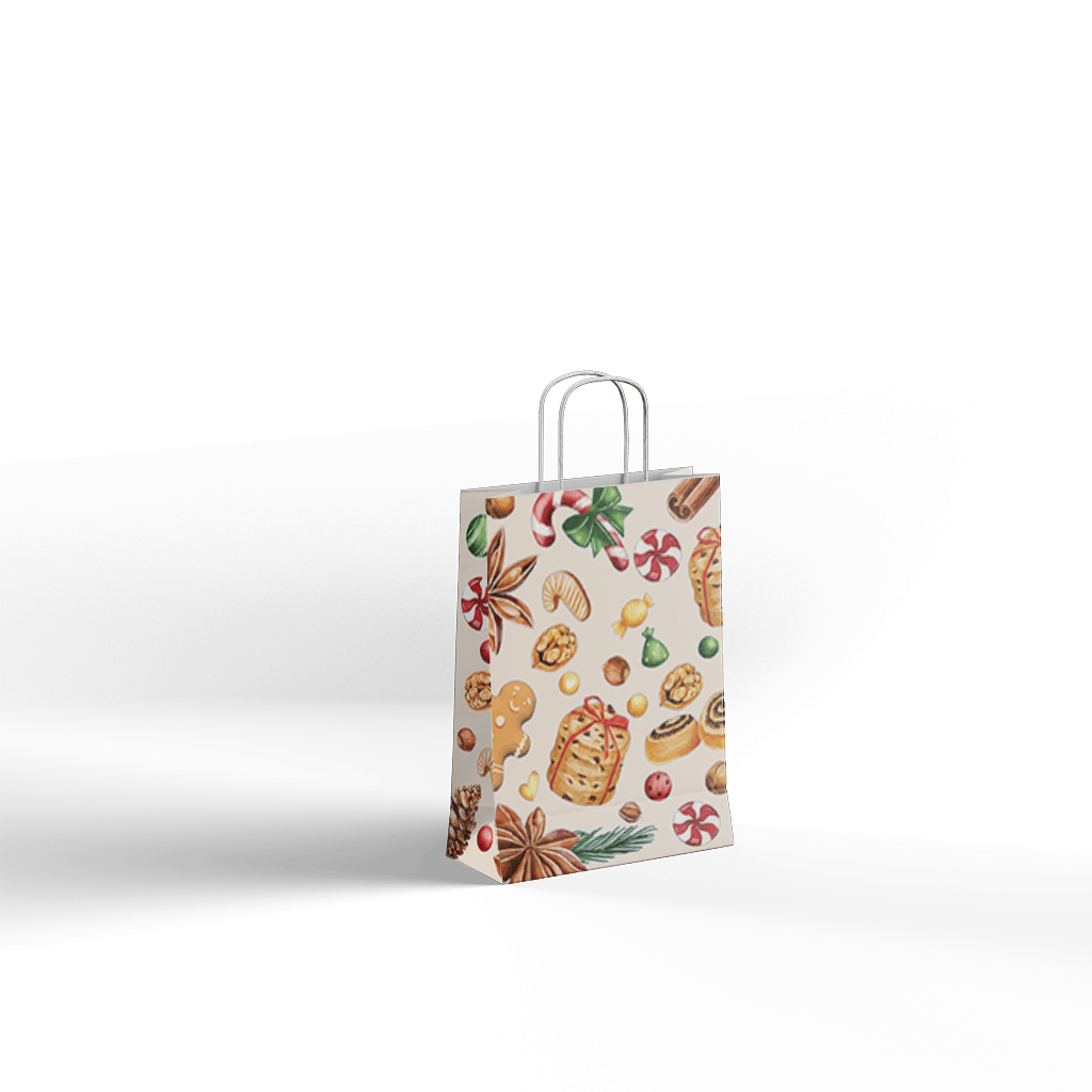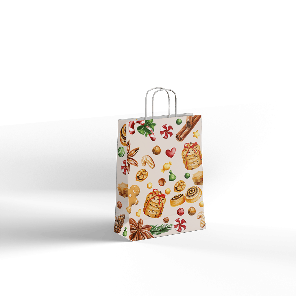 Papirnata darilna vrečka CHRISTMAS DELIGHTS z bogato praznično grafiko dobrot, kot so piškoti, cimet, potičke in sladkarije, v prostor vnese toplino in domačnost božičnega časa. Svetla podlaga z ilustracijami tradicionalnih prazničnih motivov je odlična izbira za elegantno zavijanje božičnih daril, slaščic ali sezonskih darilnih paketov.