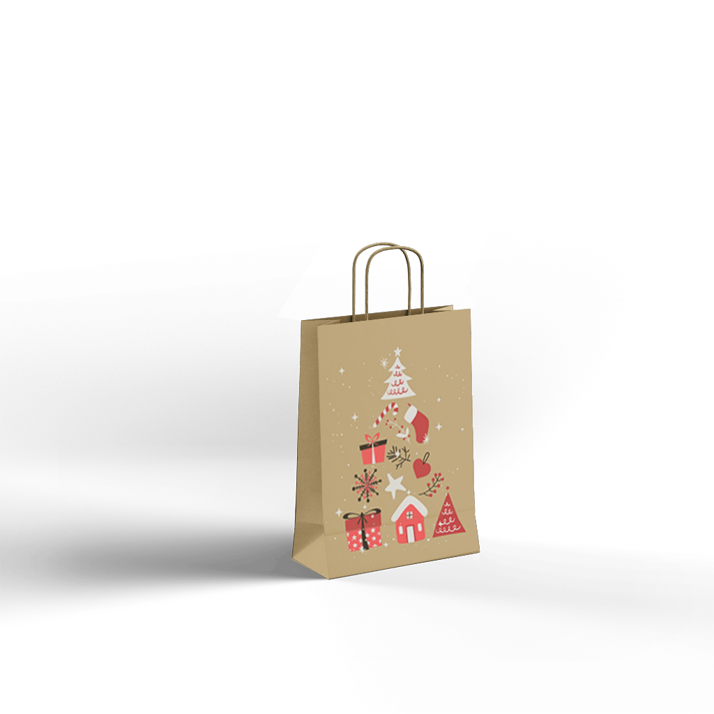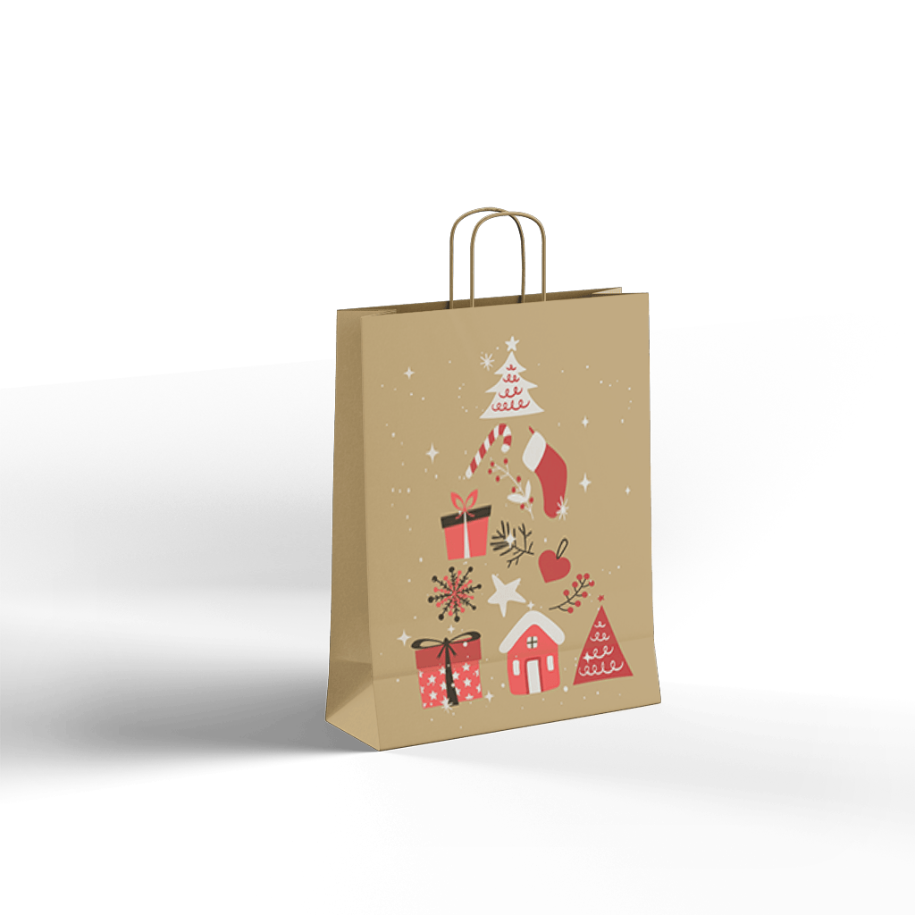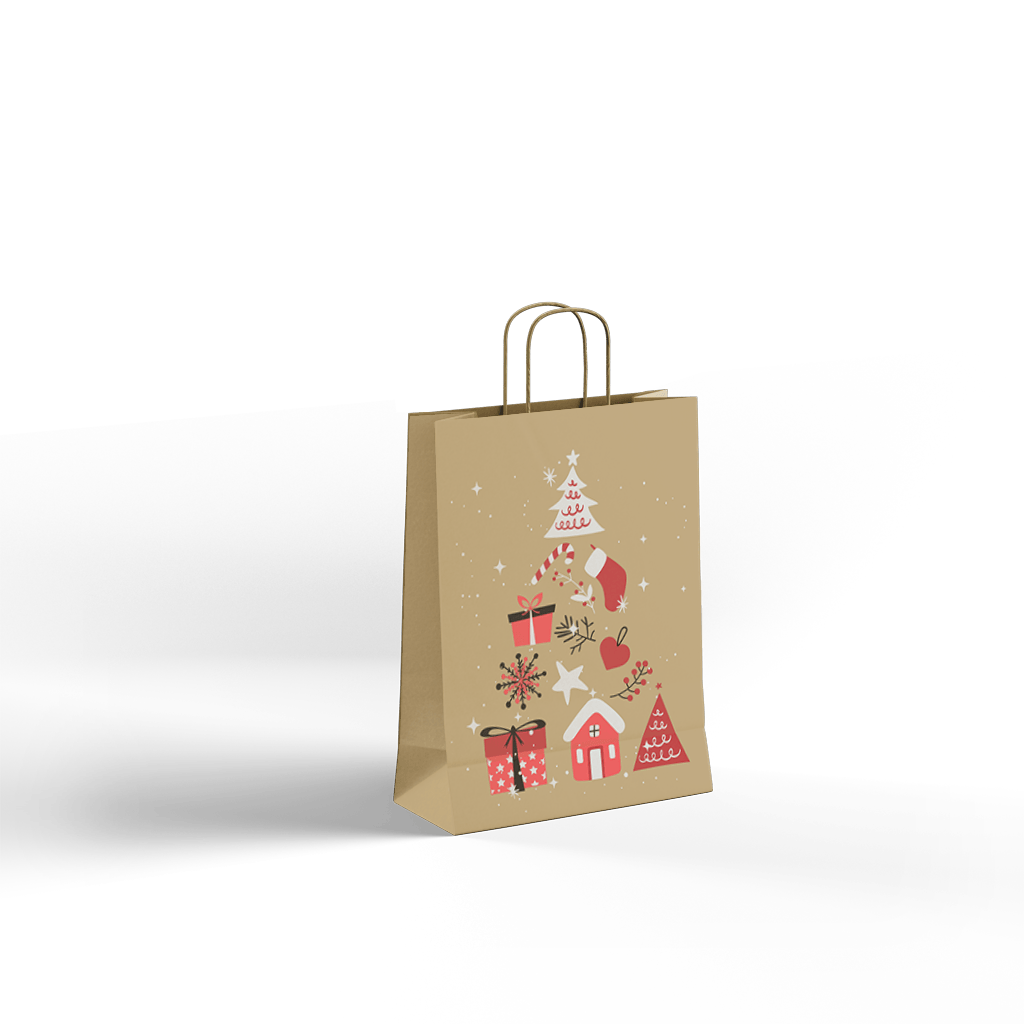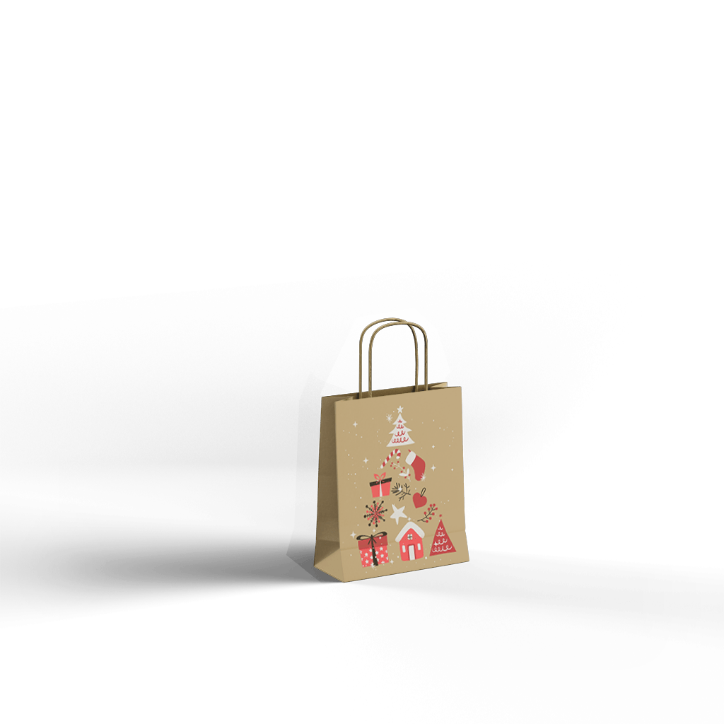 Papirnata darilna vrečka CHRISTMAS TREE z božično grafiko drevesca, snežink, lizik in očarljivih hišk ustvarja topel, naraven praznični vtis. Umirjena barvna kombinacija v rjavih tonih je odlična izbira za elegantno zavijanje božičnih daril, sezonskih paketov ali poslovnih pozornosti.