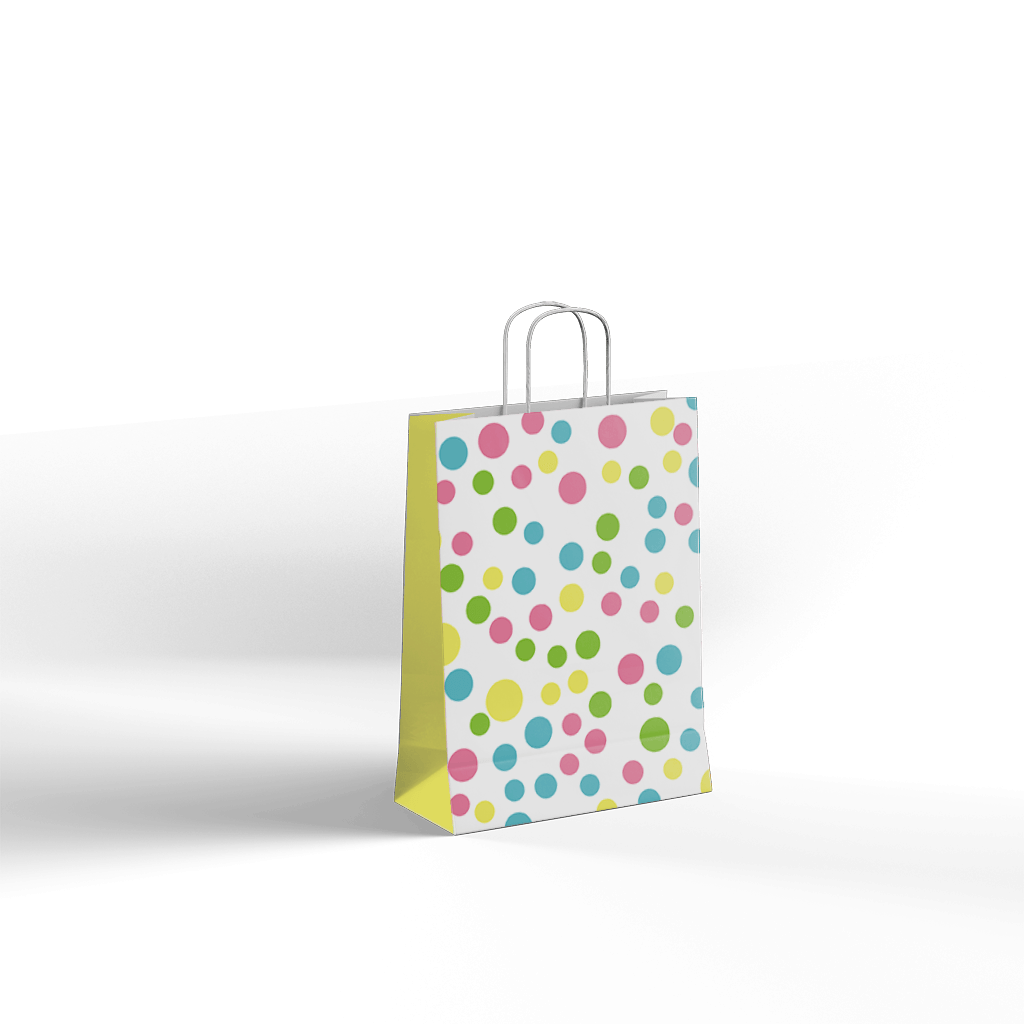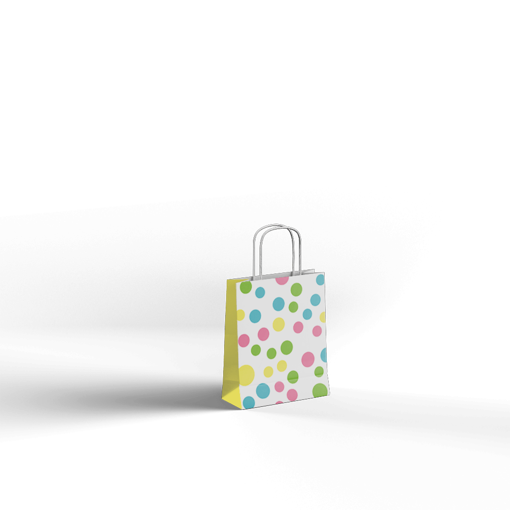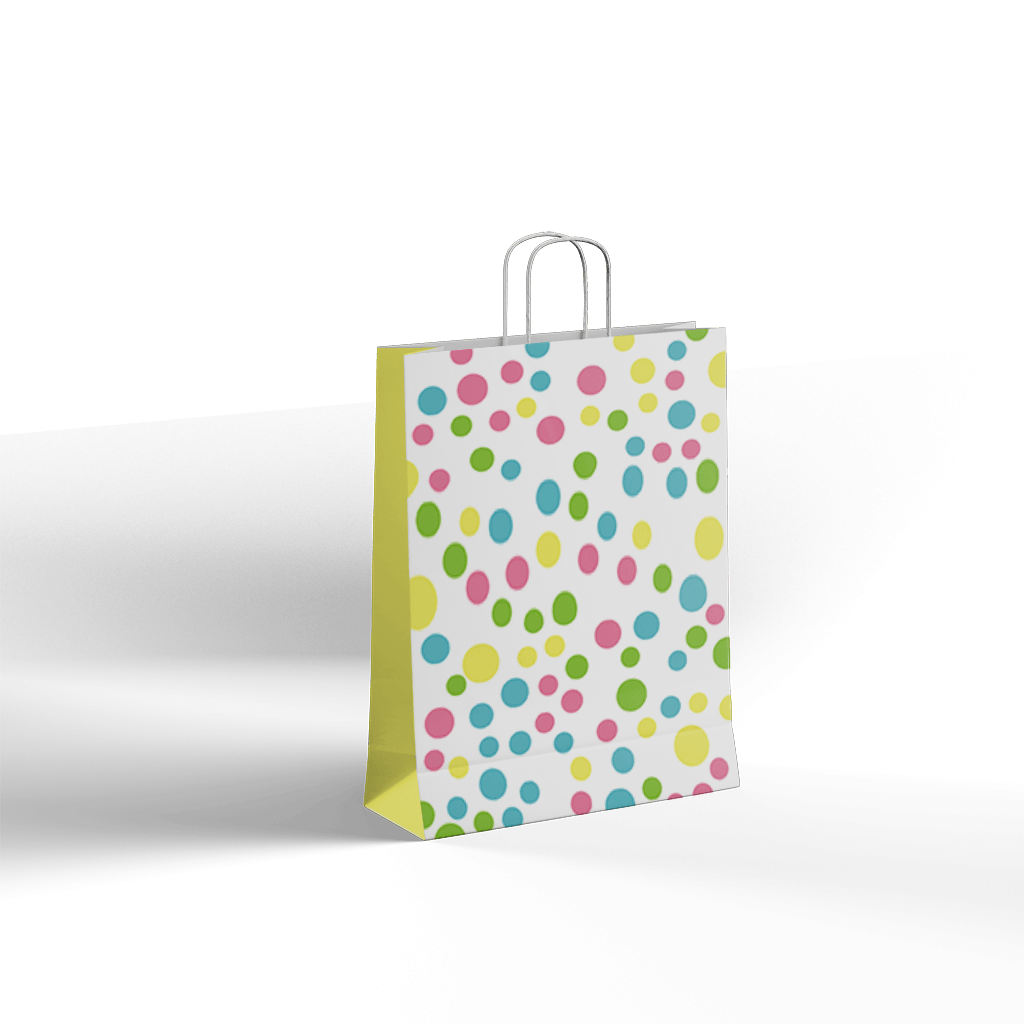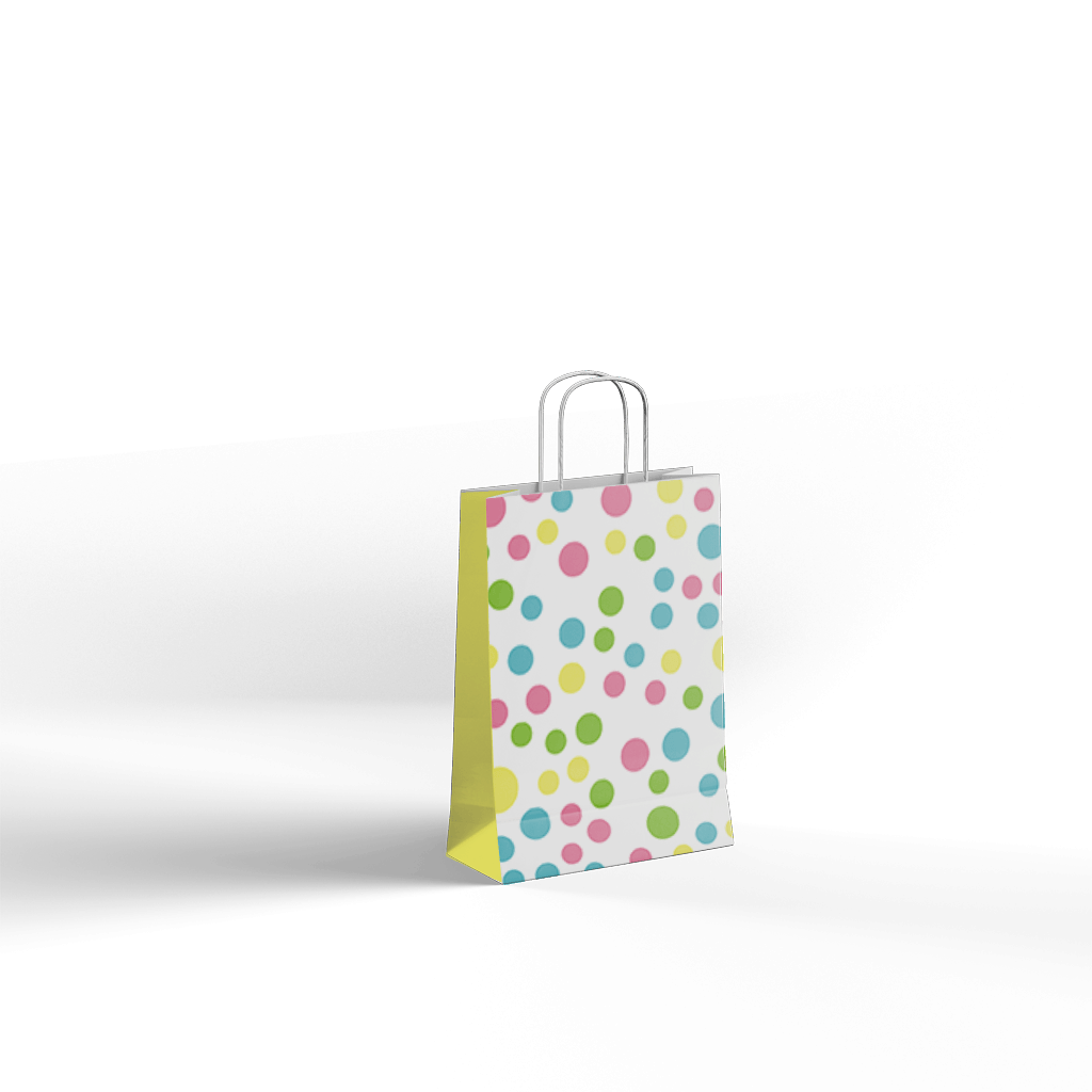 Izdelana je iz kakovostnega belega kraft papirja, ki zagotavlja trdnost in čist videz, medtem ko bela zvita (pletena) ročka omogoča udobno nošenje ter lepo dopolnjuje barvito grafiko. Zaradi svoje univerzalne zasnove je vrečka primerna za različne vrste daril in priložnosti.